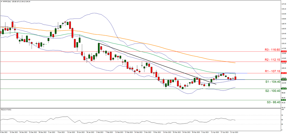 Looking at #MMM Daily chart we observe investors remaining on edge following First Republic’s announcement yesterday, despite a better-than-expected earnings report by 3M. We hold a neutral outlook for 3M should the price action remain between the 104.40 (S1) support and the 107.15 (R1) resistance levels. Supporting our case is the RSI indicator below our daily chart which currently stands near 50 and the formation of a sideways channel since the 12th of April, indicative of indecision surrounding the stock. For a bullish outlook, we would like to see a clear break above the 107.15 (R1) resistance line with the next potential target for the bulls being the 112.15 (R2) resistance barrier. For a bearish outlook we would like to see a clear break below the 104.40 (S1) support level, with the next possible target for the bears being the 100.40 (S2) support line.