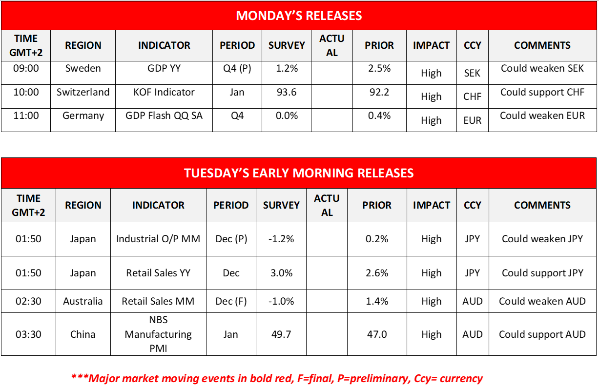 On Tuesday we highlight Eurozone’s and France’s preliminary quarter-on-quarter GDP rate for Q4, Germany’s preliminary year-on-year HICP rate for January, Canada’s month-on-month GDP rate for November and the US Consumer Confidence for the month of January. On Wednesday we highlight the Fed’s February interest rate decision and the speech from Fed Chair Powell following the decision. Furthermore, we note Eurozone’s preliminary year-on-year HICP print for January, China’s final Caixin Manufacturing PMI alongside Germany’s and Canada’s S&P Manufacturing PMI figures, all for the month of January. Lastly, from the US we note the ADP National Employment figure for January, the JOLTS Job Openings figure for December and the ISM Manufacturing PMI figure for January. On Thursday, we highlight the interest rate decisions from the Bank of England, the European Central Bank and the Central Bank of the Czech Republic. Also, from the US we note the weekly initial jobless claims and the Durable Goods orders for the month of December. On Friday we highlight the employment report for January from the US, with the Non-Farm Payrolls, the unemployment rate and month-on-month Average Earnings figures being updated. We also note a wide array of Services PMIs from Australia, Japan, China, France, the Eurozone and the UK all for January and finally the US ISM non-manufacturing PMI for the same month.