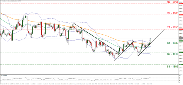 On a technical level we note that gold’s price was on the rise in the past few days breaking the 1932 (S1) resistance line, now turned to support. We tend to maintain a bullish outlook for gold’s price as long as the bullion’s price action remains above the upward trendline incepted since the 6th of July. Furthermore, we note that the RSI indicator has reached the reading of 70, showcasing the dominance of the bullish sentiment in the market, yet also warning that the precious metal may have reached overbought levels and may be ripe for a correction lower. Similar signals are being sent by the Bollinger bands as the price action has reached the upper boundary, which in turn may ease the bull’s appetite.