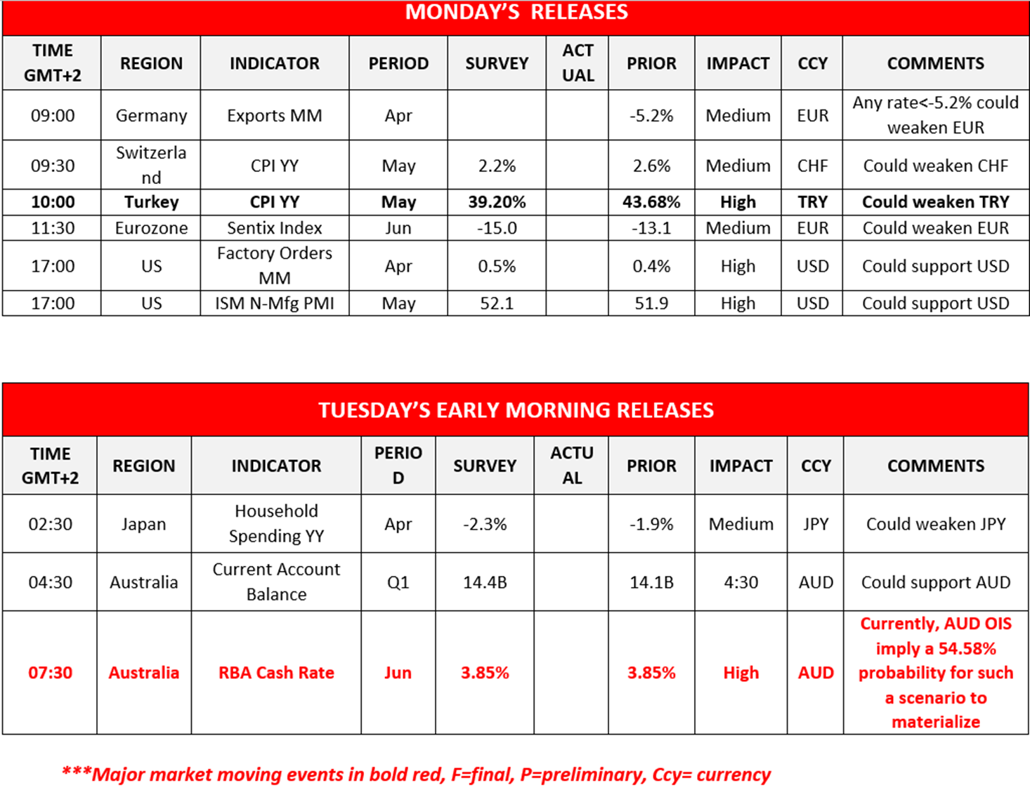 In today’s European session, we note the release of Germany’s exports for April on a mom basis, followed by Switzerland’s and Turkey’s CPI rates for May and the Eurozone’s forward-looking Sentix index for June. During the American session, we note the US Factory Orders rate on a mom level for April followed by the ISM Non-Manufacturing PMI figure for May. Lastly, during tomorrow’s Asian session, we note Japan’s Household spending rate on a YoY basis, followed by Australia’s Current Account figure for Q1 and RBA’s interest rate decision for June.