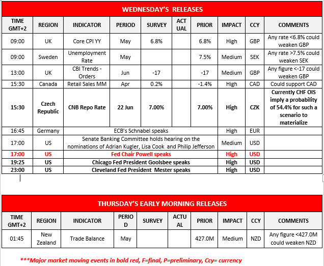 During today’s European session we note the UK’s Core CPI rates for May, Sweden’s Unemployment rate, the UK’s CBI figure. In the American session, we note Canada’s retail sales rate for April. On a monetary level, we note the speech by ECB’s Schnabel, the Czech’s Republic’s interest rate decision, the US Senate Banking Committee hearings for the nominations of Kugler,Cook and Jefferson to positions within the Fed, Fed Chair Powell’s testimony before the House, Chicago Fed President Golsbee’s and Cleveland Fed President Mester’s speeches.