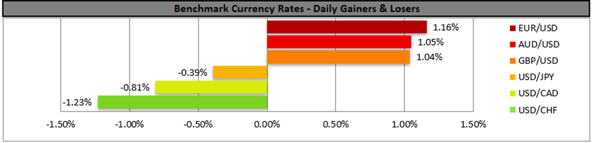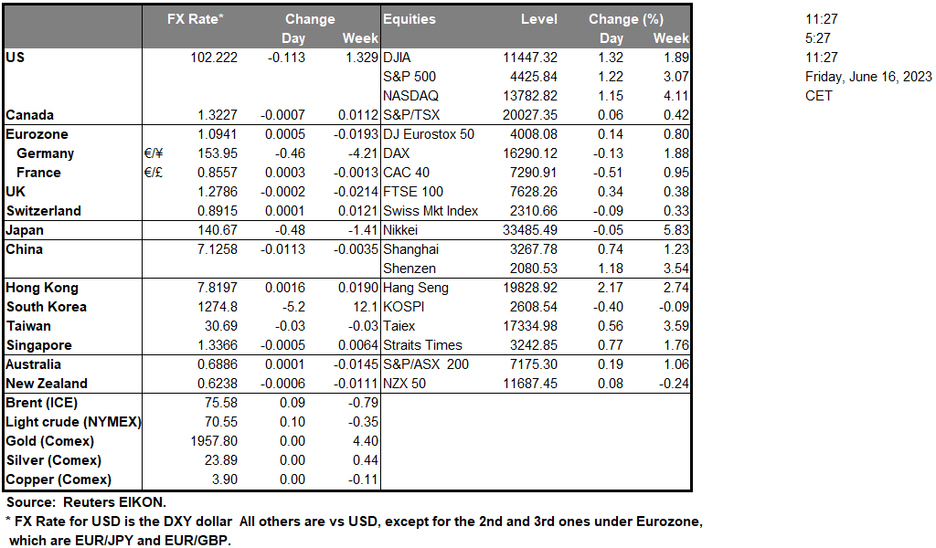 The USD lost ground across the board yesterday against its counterparts allowing for gold’s price to rise, while US stock markets were clearly in the greens implying a more risk on market sentiment. The EUR is about to end the week stronger against the USD, JPY and GBP in a sign of a broader strength for the common currency. On a monetary level, ECB’s interest rate decision tended to provide additional support for the EUR, as the bank hiked rates as expected by 25 basis points and also signaled that more rate hikes lay ahead. It’s characteristic that ECB President Christine Lagarde in her press conference that followed the release of the decision, reaffirmed that the bank is not at the end of its rate hiking cycle with another 25 basis points rate hike in the July meeting being probable. This was also the market’s expectation and EUR traders seem not to have been disappointed. EUR/USD rose yesterday and broke the 1.0855 (S1) resistance line, now turned to support. We tend to maintain our bullish outlook for the pair as the slope of the pair’s movement indicative of the upward trendline has steepened. Furthermore we highlight the RSI indicator which has risen above the reading of 70, indicative of the strong bullish sentiment of the market yet at the same time the RSI indicator may imply that the pair has reached overbought levels and may be ripe for a correction lower. Similar signals come from the Bollinger bands, as the pair broke the upper boundary in its upward movement before stabilizing somewhat in today’s Asian session. Should the bulls maintain control over the pair we may see it breaking the 1.1000 (R1) resistance line and set as the bulls’ next possible target the 1.1175 (R2) resistance level. Should on the other hand the pair correct lower and the bears find a chance to take over, we may see EUR/USD correcting lower breaking the prementioned upward trendline in a first sign that the upward movement has been interrupted, break the 1.0855 (S1) support line and aim for the 1.0695 (S2) level.