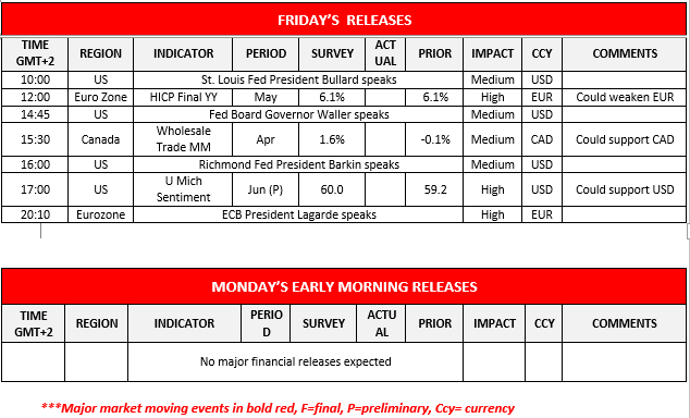 Today we note the release of Eurozone’s final HICP rate for May, Canada’s wholesale trade for April and the preliminary US University of Michigan consumer sentiment for June. On the monetary front, we note the speeches of St. Louis Fed President Bullard, Fed Board Governor Waller, Richmond Fed President Barkin and ECB President Lagarde.