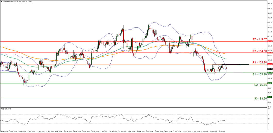 Volkswagen’s stock price appears to be moving in a sideways fashion. We maintain a sideways bias for the company’s stock price and supporting our case is the sideways moving channel which was incepted on the 14th of June in addition to the narrowing of the Bollinger bands which may imply low market volatility. For our sideways bias to continue, we would require the company’s stock price to remain confined within the sideways moving channel defined by the 103.90 (S1) support level and the 108.20 (R1) resistance line. On the flip side, for a bearish outlook we would require a clear break below the 103.90 (S1) support level, with the next possible target for the bears being the 98.60 (S2) support base. Lastly, for a bullish outlook, we would require a clear break above the 108.20 (R1) resistance line, with the next possible target for the bulls being the 114.00 (R2) resistance line.