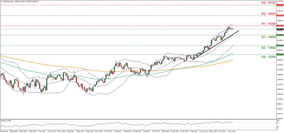 Nasdaq’s rise over the past month seems to have hit a ceiling on the 15300 (R1) resistance line and corrected a bit lower. For the time being we view the consolidation of the index’s price action as a mere correction for now, given that the upward trendline guiding the index remains intact. Furthermore please note that the RSI indicator despite correcting a bit lower is still above the reading of 70 underscoring the bullish sentiment of the market, yet may also imply that the index is currently at overbought levels and needs to correct even lower. Please note that the consolidation lower of Nasdaq’s price action began after it hit on the upper Bollinger band, which allowed for some room to be created between the price action and the upper Bollinger band, hence the bulls may have space to cover. Should the bulls maintain control over the index’s direction, we may see Nasdaq breaking the 15300 (R1) resistance line and aim for the 16000 (R2) resistance barrier. On the flip side for a bearish outlook the current correction lower is not enough. To call in the bears, we would require Nasdaq to drop below the prementioned upward trendline, in a first sign that the upward movement has been interrupted, break the 14650 (S1) support line clearly and start aiming for the 13920 (S2) support level.