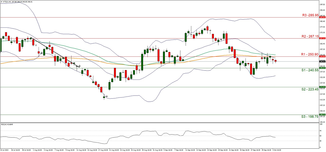 Tesla has missed its Q3 delivery expectations that had been set by market analysts. Furthermore, the company’s deliveries were nearly 7% less than the previous quarter, which may be a source of concern for the company which is also facing potential issues from an EU probe in the Chinese subsidies received by EV car makers, as we had reported last week. According to a company statement, the cause behind the decline was attributed to “planned downtimes for factory upgrades, as discussed on the most recent earnings”, in addition the company stated that they were still on target for the 2023 volume target of around 1.8 million vehicles. The expectation that the company is still on track to meet its target volume, could provide some respite to investors, which may have been on the edge since last week. However, the fact that its deliveries came in much lower than last quarter, seem to be weighing on the company. Furthermore, we note that in the recent days, news outlets have been reporting that Tesla’s gigafactory in Germany has seen a “high frequency” of staff injuries. The potential safety issues in question, could weigh on the company’s ambitions to meet that target, as such we remain sceptical of the company’s claims that they are still on track to deliver near 1.8 million vehicles by the end of the year. On the other hand, should the company in their earnings report in two weeks’ time, indicate that they are still on track to deliver the aforementioned volume of vehicles, we may see the stock gaining support.