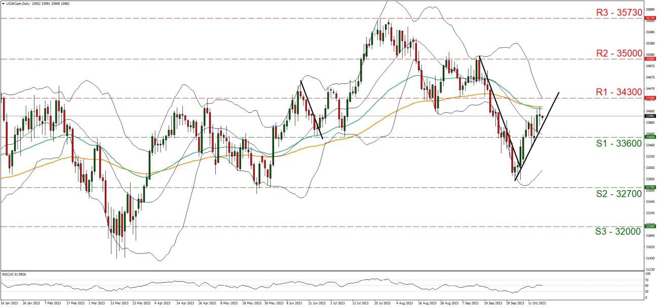 Across the Pacific, Chinese data took the markets by surprise as the GDP rate for Q3, industrial production and retail sales growth rates for September did not slow down as far as expected. Yet we note that embattled property developer Country Garden, is at risk of defaulting on its entire offshore debt, following the company missing its payment deadline on Tuesday. The failure to repay its $15 million coupon, following a 30-day grace period, appears to be reflecting China’s deteriorating property sector, following the collapse of Evergrande. The issue highlights the headwinds placed by the construction sector to the recovery of the Chinese economy and a loss of confidence in its outlook could weigh on the market sentiment and thus on US stock markets as well.