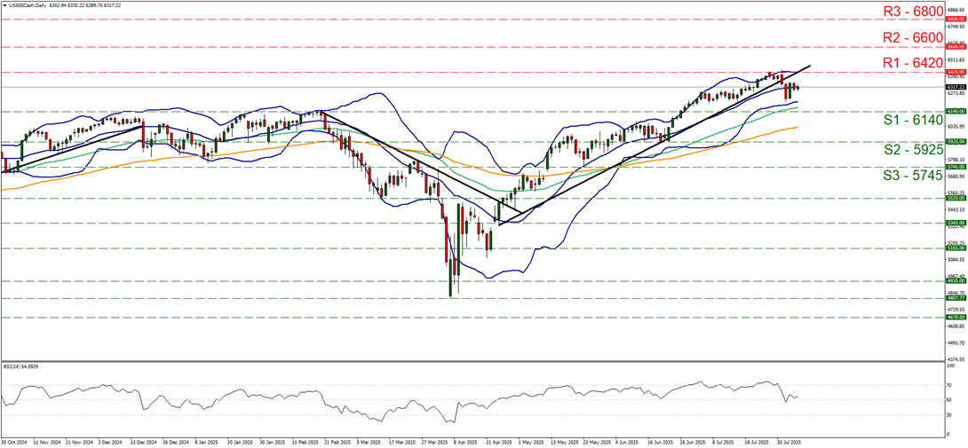 We had a number of developments regarding the Fed since our last report. On Wednesday, the Fed’s forward guidance released with its interest rate decision tended to highlight the bank’s hesitation towards a possible easing of its monetary policy which in turn eased the market’s expectations to cut rates until the end of the year. Yet the release of the US employment report for July, provided a shock for the market as the NFP figure dropped substantially beyond market expectations, while at the same time the unemployment rate ticked up and the NFP figures of June and May was revised lower by an aggregated 258k. Overall the release tended to highlight the rapidly deteriorating conditions in the US employment market and thus revived the market’s dovish expectations. Currently the market prices-in the bank to cut rates twice until the end of the year, in the September and October meetings. Furthermore Fed Board Governor Kugler resigned, a development that allows US President Trump to switch a hawk with a dove in the FOMC. Furthermore, US President Trump stated yesterday that he has narrowed the list of potential names to replace Fed Chairman Powell and that he will be naming the successor of Powell by Friday. Should the nominee, seem to be adhering to US President Trump’s dovish wishes, we may see the market’s dovish expectations intensifying. Should we see Fed policymakers in the coming week adopting a more dovish stance, we may see US stock markets getting some support as the prospect of easing financial conditions in the US economy could intensify.