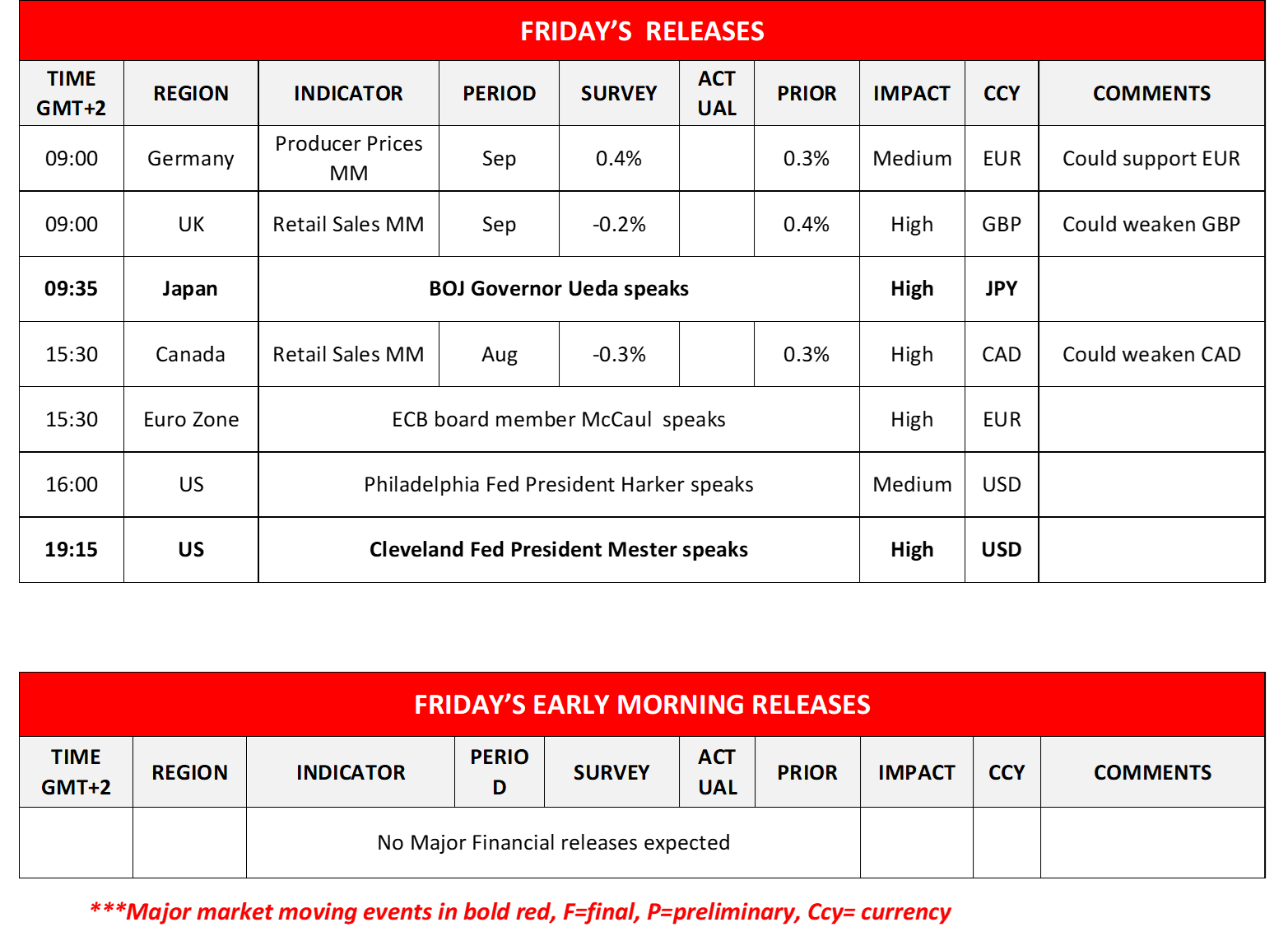 In the European session we get Germany’s Producer prices rate for September, the UK’s retail sales rate for September and ending of the day is Canada’s retail sales rate for August. On a monetary level, we note the speech by BOJ Governor Ueda during the European session and the speeches by Philadelphia Fed President Harker and Cleveland Fed President Mester during the American session.
