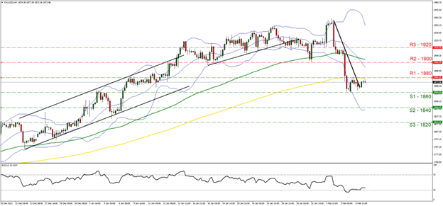 Market participants however, were forced to alter their assessments after a blowout employment report on Friday, which showcased once again that the labour market remains robust albeit a high interest rate environment. More specifically, Non-Farm payrolls unexpectedly rose to 517k in the month of January, obliterating forecasts for a slowdown to 185k. Equally the average hourly earnings rose to 4.4% beating estimates of 4.3% while the unemployment rate fell to five decades lows, being reported at 3.4%, below expectations for a rise to 3.6%. The results practically reaffirmed the Fed’s view that interest rates will stay higher for longer, as job growth accelerated sharply in January and broadcasted that the employment market is yet to show any cracks. As a result the precious fell sharply from its nine-month highs as the dollar gained traction. Moreover, the better-than-expected ISM non-manufacturing PMI figure, which rebounded from contraction territory in January and returned to growth, provided extra support for the dollar and aggravated gold’s fall. Also, the benchmark 10-year treasury yield rose from its temporary fall to the 3.4% level after the “dovish” Fed decision and reclaimed the 3.6% level after the stellar employment report, nudging investors to reassesses their prospects for a Fed pivot in the second half of the year. Lastly, we would like to note Fed Chair Powell’s speech later today and it would be interesting to see whether he would press on with his hawkish narrative. Should that be the case we may see some support for the dollar and gold relenting more ground.