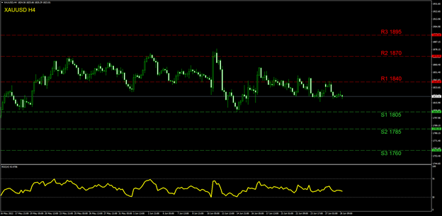 Gold is currently trading between the (R1) 1840 resistance and the (S1) 1805 support levels which makes them both the most probable targets in a buying or selling strategy accordingly. Yet since the 9th of May Gold’s price action has moved in a broader sideways motion between the (R2) 1870 resistance and the (S1) 1805 support making these levels the highest and the lowest Gold has tested since the noted period. Outside this range we also note the (S2) 1785 barrier which could be engaged in an extensive bearish trend and could form a new 2022 low for the precious metal. Overall, we tend to maintain our sideways bias for Gold’s current trend as our personal view, while the RSI indicator below our chart seems to be cruising across the 44 level implying some selling may be in play for now.