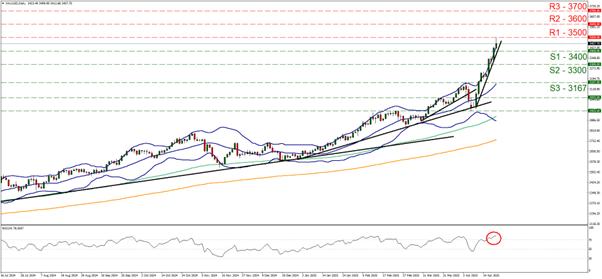 On a technical level, we highlight that Gold’s price continued to rally over the past week and yesterday broke the 3400 (S1) resistance line, now turned to support and continued to rise testing the 3500 (R1) resistance level in today’s Asian session, reaching new record high levels. We also note the steepening of the upward movement of gold’s price action over the past two weeks, underscored by the upward trendline guiding it.