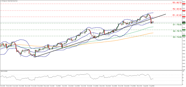 WTI’s price dropped yesterday breaking the 81.25 (R1) support line, now turned to resistance and continued lower to test the 79.00 (S1) support level. Given that the commodity’s price in its downward movement broke the upward trendline incepted on the 28th of June, we temporarily switch our bullish outlook in favour of a sideways motion bias. Please note that both the 100 (Green line) and the 200 (Orange line) moving averages continue to point upwards implying a continuation of the upward movement, yet the more sensitive 20 moving average (blue line) also serves as the median of the Bollinger bands, has already started to bend downwards.