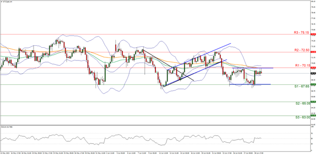 On the other hand, for a bearish outlook we would like to see a clear break below support at 67.65 (S1) with the next possible target for the bears being the 65.05 (S2) support level. However, we note that China’s NBS Manufacturing PMI figures for June, due tomorrow could heavily impact oil’s direction.