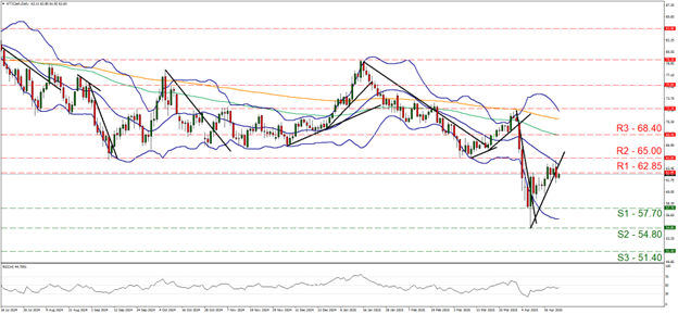 For the adoption of a bullish outlook we would require WTI’s price to break above the 62.85 (R1) resistance line clearly and continue to also break the 65.00 (R2) resistance level, with the next possible target for the bulls being the 68.40 (R3) resistance barrier.