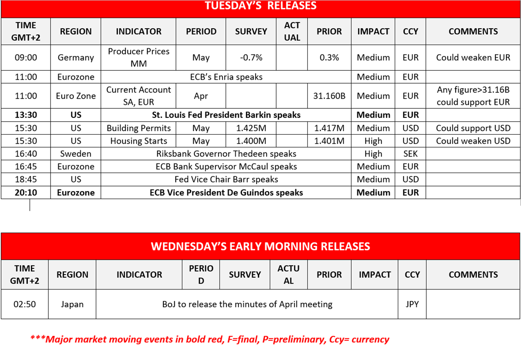 In today’s European session we note the release of Germany’s producer prices rate for May, the Eurozone’s current account figure for April. In the American session, we note the US Building Permits and Housing starts figures both for May. On a Monetary level, we note the speeches by ECB Enria, Riskbank Governor Thedeen, ECB’s McCaul, Fed Vice Chair Barr and lastly ECB Vice President De Guindos. Furthermore, we highlight the release of the BOJ’s monetary policy meetings during tomorrow’s Asian session.