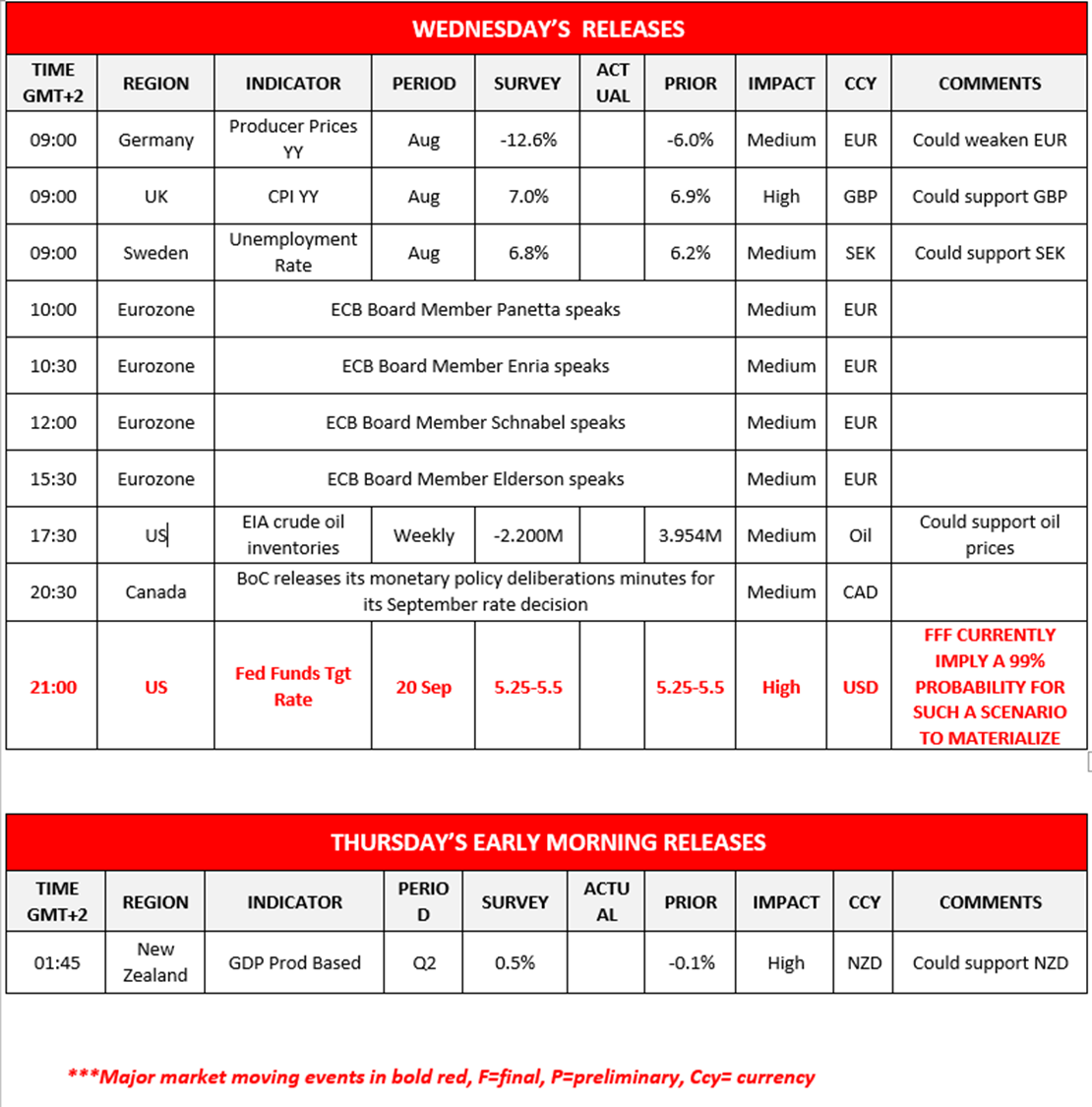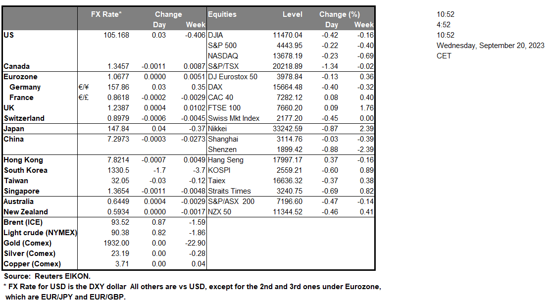 The Fed’s interest rate decision is due out today, with the majority of market participants anticipating that the Fed will remain on pause, amidst the backdrop of the US housing starts figure dropping to the lowest point since 2020, painting a worrying sign for the US economy. In addition, the US House of Representatives passed a measure that would temporarily increase the Government’s spending ability whilst avoiding a government shutdown, yet the Senate Majority leader Schumer, stated that the bill would be “dead” on arrival, thus potentially resulting to a second round between Republicans and Democrats in a government shutdown scenario. In Canada the BOC Core CPI rates came in higher than expected, hinting at persistent inflationary pressures in the Canadian economy, which could increase pressure on the bank to resume its rate hiking cycle and as such could provide support for the CAD. Over in the UK, the CPI rates for August edged lower, hinting at easing inflationary pressures in the UK economy as the BOE prepares to meet to discuss its next interest rate decision. The lower-than-expected CPI rates could potentially ease pressure on the bank should they wish to adopt a more dovish tone or should the decide to remain on pause, albeit an unlikely scenario. In the commodities markets, the liquid gold appears to be halting its upwards trajectory, despite the API weekly oil inventories reporting a wider than expected drawdown of the US oil inventories.  In Europe, ECB’s Villeroy stated that “The ECB is not at the point today where we could cut rates”, hinting that the current interest rates will remain at current levels for a prolonged period of time, which could provide support for the common currency in the long run if  the ECB’s counterparts cut rates earlier. Lastly, we note the increasing tensions between Poland and Ukraine over Poland’s ban on Ukrainian grain, as such should the ban be lifted and an influx of grain is seen in Europe, we may see the price of Wheat moving to lower ground.