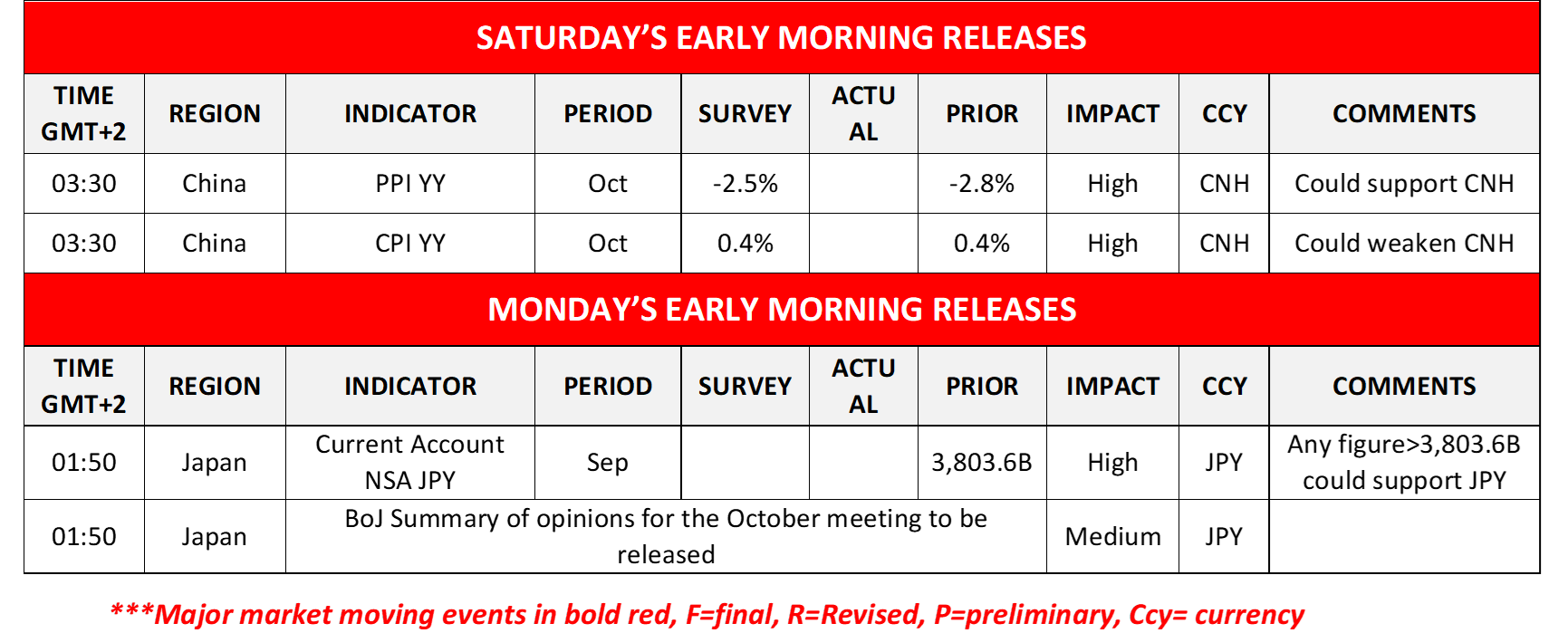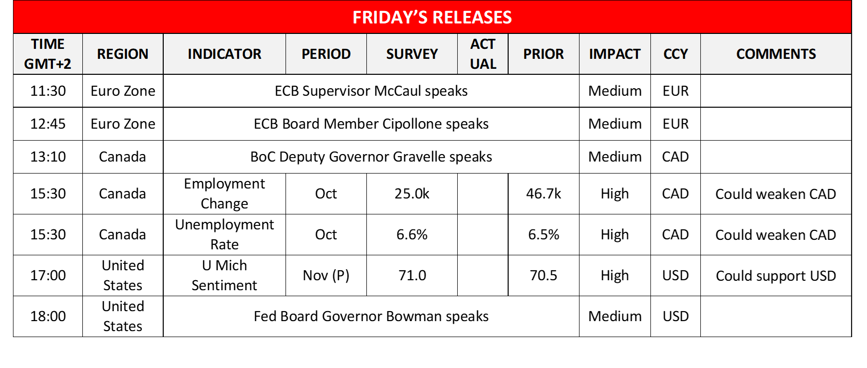Today we get Canada’s October employment data and from the US the preliminary University of Michigan consumer sentiment for November. On the monetary front, we note that ECB Supervisor McCaul, ECB Board Member Cipollone, BoC Deputy Governor Gravelle and Fed Board Governor Bowman are scheduled to speak. Tomorrow, Saturday, China’s October inflation metrics are to be released and on Monday’s Asian session we get Japan’s September current account balance, while BoJ is to release the summary of opinions for the October meeting.