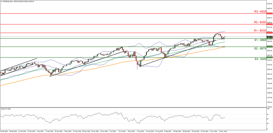 S&P 500 appears top be moving in an overall upwards fashion after moving lower and confirming the support turned to resistance line at the 5885 (S1) level. We opt for a bullish outlook and supporting our case is the index’s failure to break below our 5885 (S1) support level, in addition to the RSI indicator below our chart currently registering a figure near the figure of 60, implying that some bullish tendencies remain. Yet at the same time the figure below 60, could also imply that the bullish momentum which has been guiding the index, may be fading away. Nevertheless, for our bullish outlook to continue, we would require a clear break above the 6030 (R1) resistance level, with the next possible target for the bulls being the 6250 (R2) resistance line. On the flip side for a sideways bias we would require the index to remain confined between the 5885 (S1) support level and the 6030 (R1) resistance line. Lastly, for a bearish outlook we would require a clear break below the 5885 (S1) support level with the next possible target for the bears being the 5675(S2) support line.