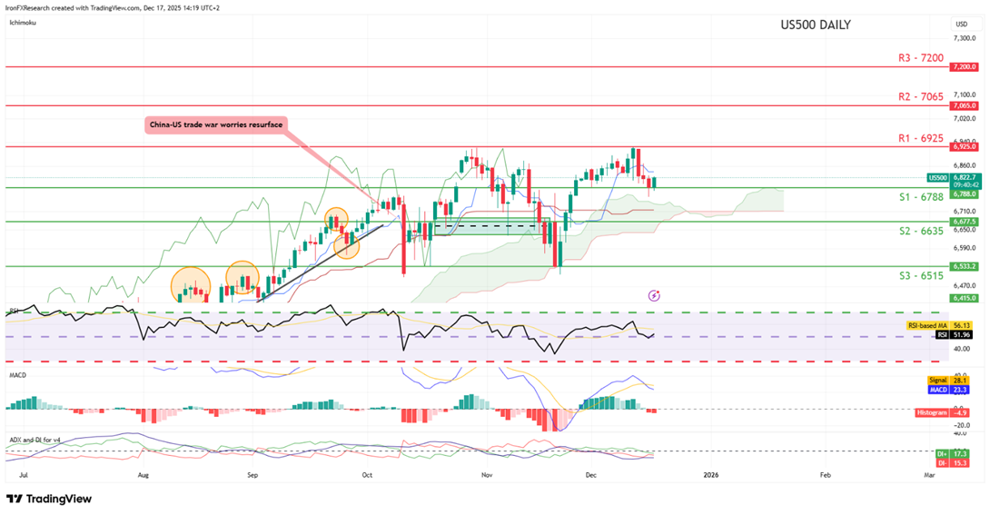 We highlight the US’s employment data for November which was released yesterday.The data showed that the labour market remained soft, leaving investors on edge about when the next rate cut from the Federal Reserve may occur. While the U.S. economy added 64,000 jobs in November, surpassing an estimate from economists polled by Reuters, the unemployment rate ticked upwards from 4.4% to 4.6% which may be the bigger issue here, as even though the NFP figure exceeded expectations, it is still at relatively low levels. However, the 43-day government shutdown distorted the data thus clouding the waters surrounding the actual state of the US Employment market. Nonetheless, the implications of a loosening labour market could increase pressure on the Fed to remain on their rate cutting path, thus easing the financial conditions surrounding the US economy, which in turn could aid the US Equities markets. Yet, we should note that the US CPI rates for November are due out tomorrow and could change the narrative and thus could weigh on the US stockmarkets should the data showcase an acceleration of inflationary pressures and vice versa.