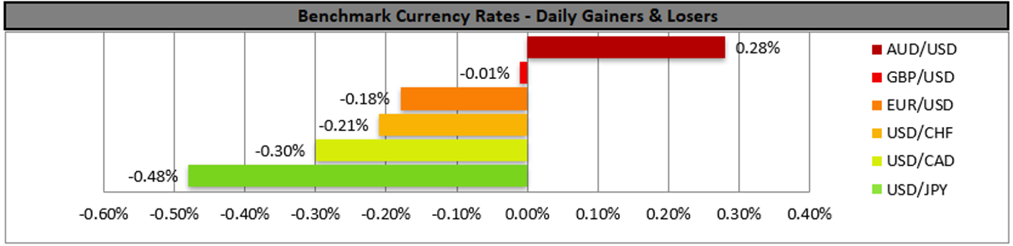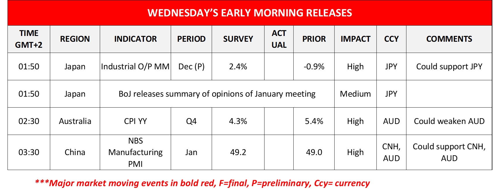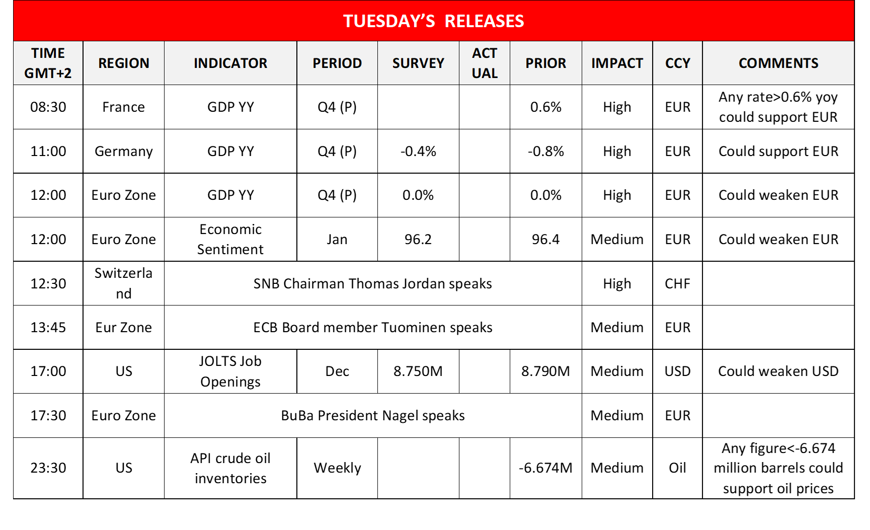 In the European session today, we highlight the release of France’s, Germany’s and the Eurozone’s preliminary GDP rates for Q4, while from the Eurozone we also get January’s economic sentiment. On the monetary front, we note that SNB Chairman Thomas Jordan and ECB Board member Tuominen are scheduled to make statements. In the American session, we note the release of the US JOLTS job openings figure for December, while oil traders may be more interested in the release of the weekly API crude oil inventories figure and EUR traders in BuBa President Nagel’s comments. During the Asian session, we note the release of Japan’s preliminary industrial output for December, Australia’s CPI rate for Q4 and China’s NBS manufacturing PMI figure for January. On the monetary front, we note for JPY traders the release of BoJ’s summary of opinions for the January meeting.