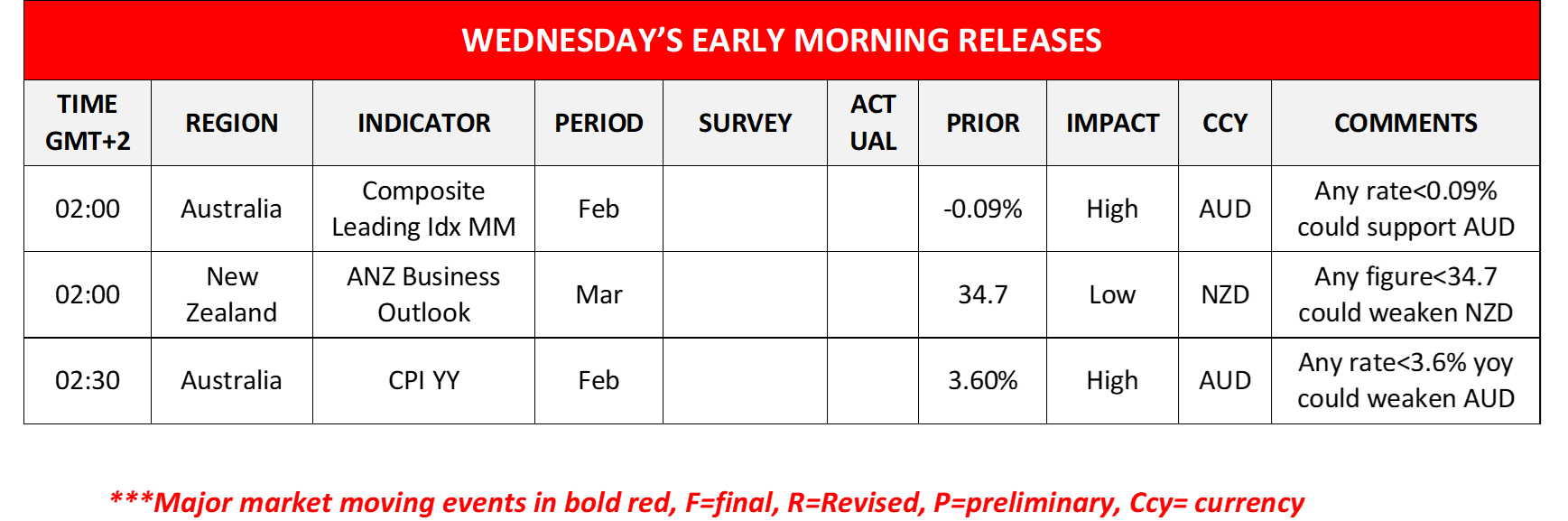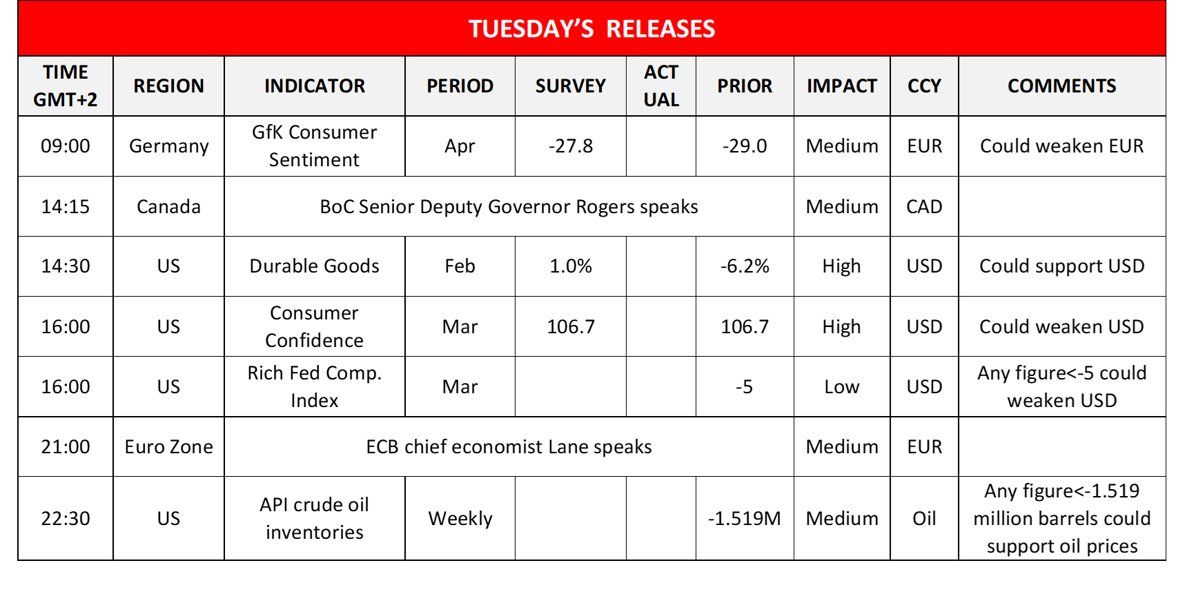 Today in the European session we note the release of Germany’s GfK consumer sentiment for April. In the American session, we get from the US the durable goods orders for February, the consumer confidence for March and the Richmond Fed Composite Index for the same month, while oil trades may be more interested in the release of the API weekly crude oil inventories figure. On the monetary front, we note that BoC Senior Deputy Governor Rogers and ECB Chief Economist Lane are scheduled to speak. During tomorrow’s Asian session, we get Australia’s Composite Leading Index for February and New Zealand’s ANZ Business outlook for March, while we highlight the release of Australia’s CPI rates for February.