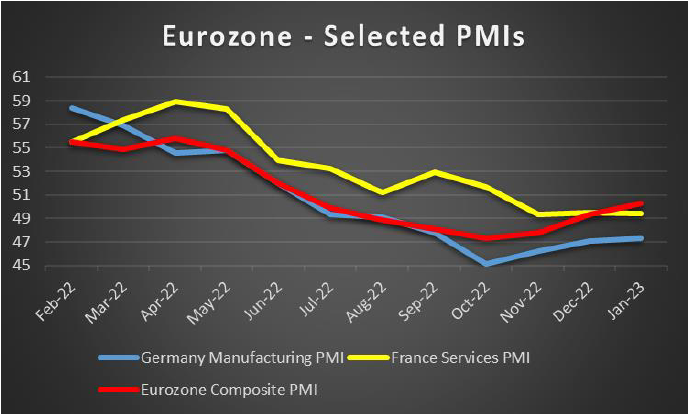 The EUR seems to end the week lower against the USD, yet is gaining against the GBP and JPY. On a macroeconomic level, we note that the second estimate of the GDP rate for Q4 reaffirmed the slowdown from Q1, which is worrying as the economy continues to slide lower, also due to ECB monetary policy tightening. Yet ECB President Christine Lagarde reiterated the bank’s intentions to keep hiking rates in order to tame inflationary pressures in the zone. At this point, we would like to note that Ms. Lagarde singled out wage growth as a potential source of durable inflation. So, overall the hawkish stance of the bank is to remain and could provide some support for the common currency on a monetary level, given its intentions for another 50 basis points rate hike in the March meeting. In the coming week, we highlight the release of the preliminary PMI figures for February, with forecasts for the Zone as a whole implying some improvement in economic activity, as even the contraction expected in the manufacturing sector is to become more narrow. Also, Germany’s ZEW, GfK and Ifo indicators are forecasted to improve which could also provide some support for the EUR, if actually so.