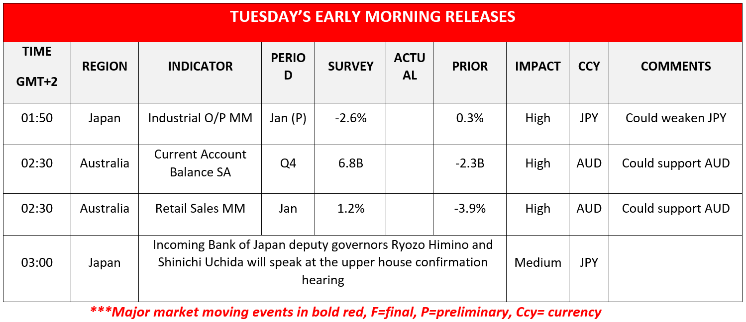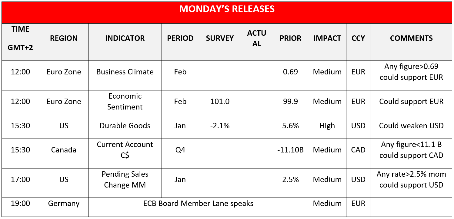 During today’s European session, we note the release of Eurozone’s business climate and economic sentiment indicators for February. In the American session, we get the US durable goods orders for January, the US pending home sales rate for January and Canada’s current account balance for Q4, while ECB board member Lane is to make statements. During Tuesday’s Asian session, we note the release of Japan’s preliminary industrial output growth rate for January and from Australia we get the current account balance for Q4 and retail sales for January.