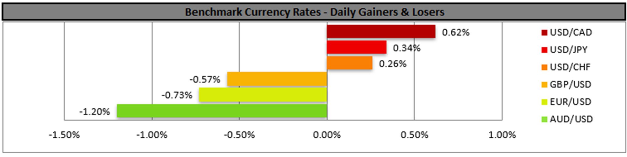 On a technical level, EUR/USD tumbled yesterday, breaking the 1.0450 (R1) support line now turned to resistance. The pair in its downward motion broke the upward trendline, guiding the pair since the 13. of January thus we abandon our bullish outlook in favour of a sideways motion bias for the time being, yet also note that the bearish tendencies may intensify. For a bearish outlook we would require the pair to break the 1.0330 (S1) support level and start aiming for the 1.0175. For a bullish outlook we would require the pair to break the 1.0450 (R1) level and continue to break also the 1.0600 (R2) level.