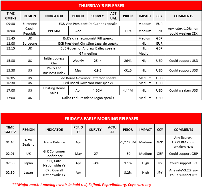 During today’s European session, we get the Czech Republic’s PPI rates for April while on the monetary front, we note that ECB Vice President De Guindos, BoE’s chief economist Pill and ECB President Christine Lagarde are scheduled to speak. In the American session, we note the release from the US of the weekly initial jobless claims figure, May’s Philly Fed Business Index and April’s Existing Home Sales for April while we also note that Fed Board Governor Jefferson, Fed Board Governor Barr and Dallas Fed President Logan are scheduled to speak. During tomorrow’s Asian session, we note the release of New Zealand’s trade data for April and UK’s GfK Consumer Confidence for May.