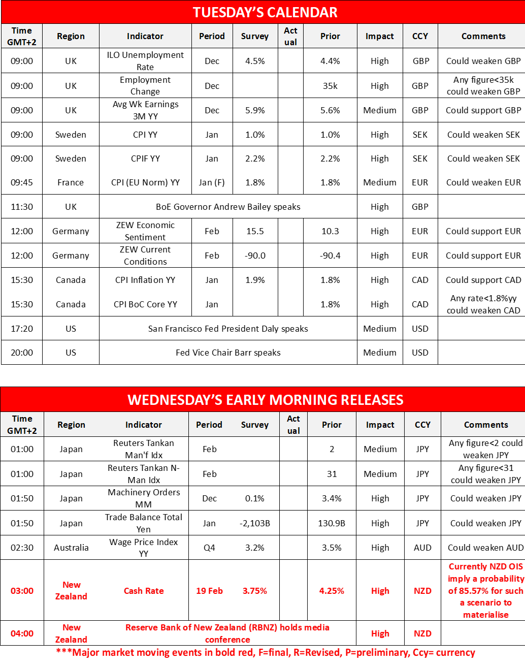 Today we get UK’s December employment data, Sweden’s January CPI rates, France’s final HICP rate for January and German’s ZEW indicators for February. On the monetary front, we note BoE Governor Bailey, San Francisco Fed President Daly and Fed Vice Chair Barr are scheduled to speak. In tomorrow’s Asian session, we get Japan’s February Tankan indexes, December’s machinery orders and January’s trade data as well as Australia’s Q4 24 wage price index.