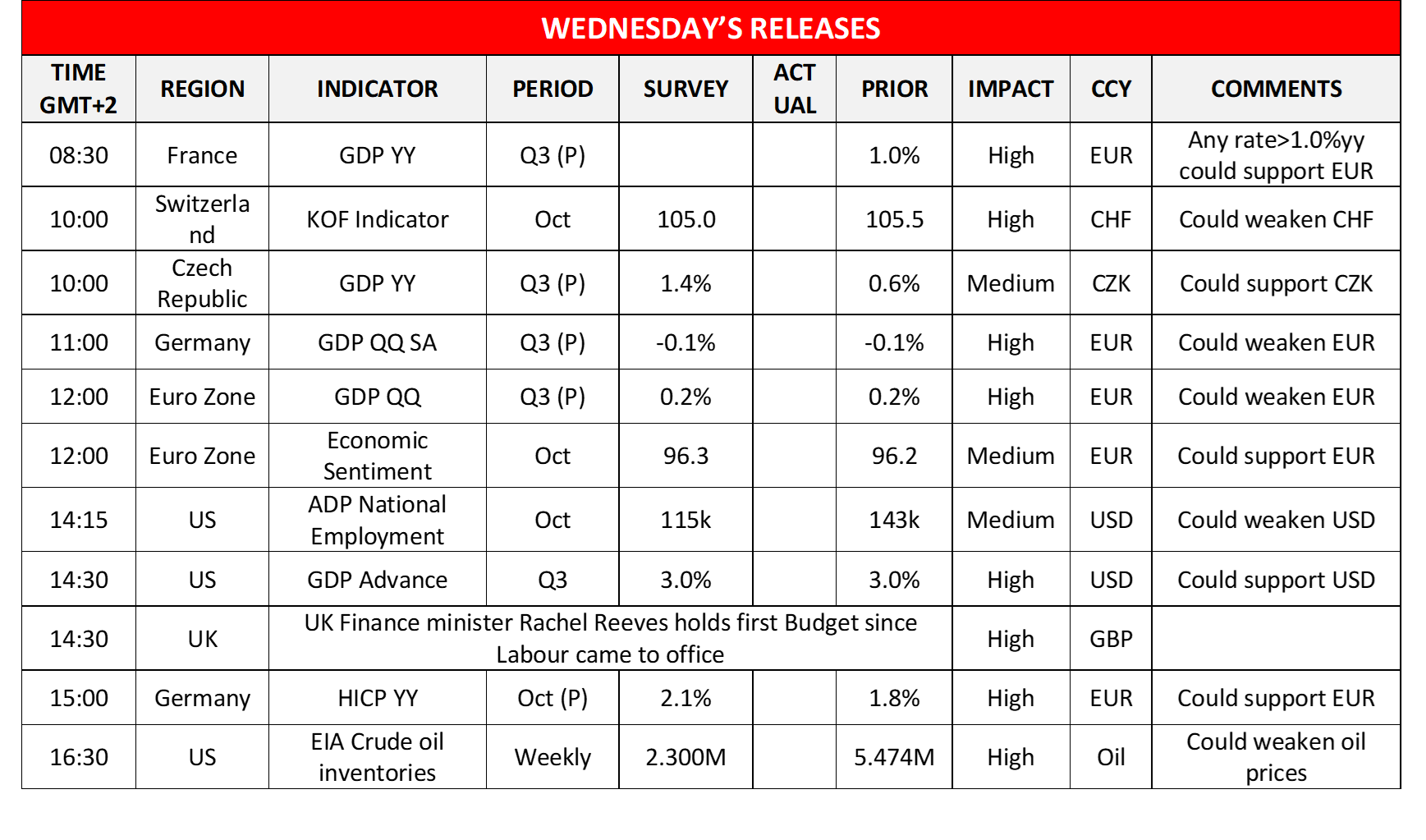 In the UK, we highlight that Finance Minister Rachel Reeves is to deliver the first budget, since the Labour party came into office. The budget could have an effect on the pound on a fiscal level, as it would show the new UK Government’s intentions. Should the budget include increased taxation and cut spending implying a tightening of fiscal policy, we may see the event having a bearish effect on the pound in today’s late European session.