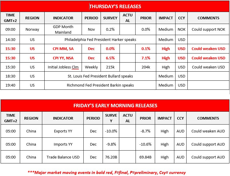 Hoy en la sesión europea, notamos la publicación del balance de cuenta corriente de Turquía para noviembre y de la República Checa las tasas del IPC para diciembre, mientras que en la sesión americana, los comerciantes de petróleo pueden estar más interesados en la publicación del crudo semanal de la EIA. cifra de inventarios. Durante la sesión asiática de mañana, observamos la publicación del saldo de la cuenta corriente de Japón para noviembre, el saldo comercial de Australia para el mismo mes y las métricas de inflación de China para diciembre.