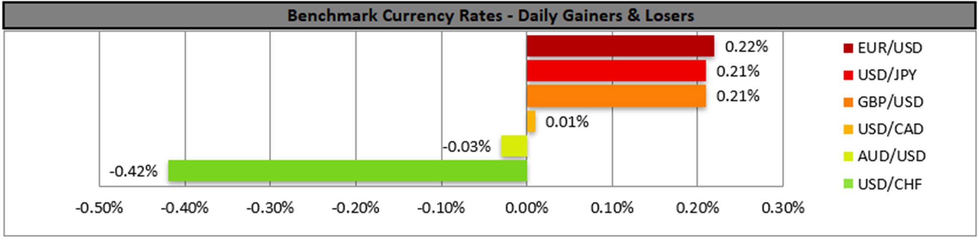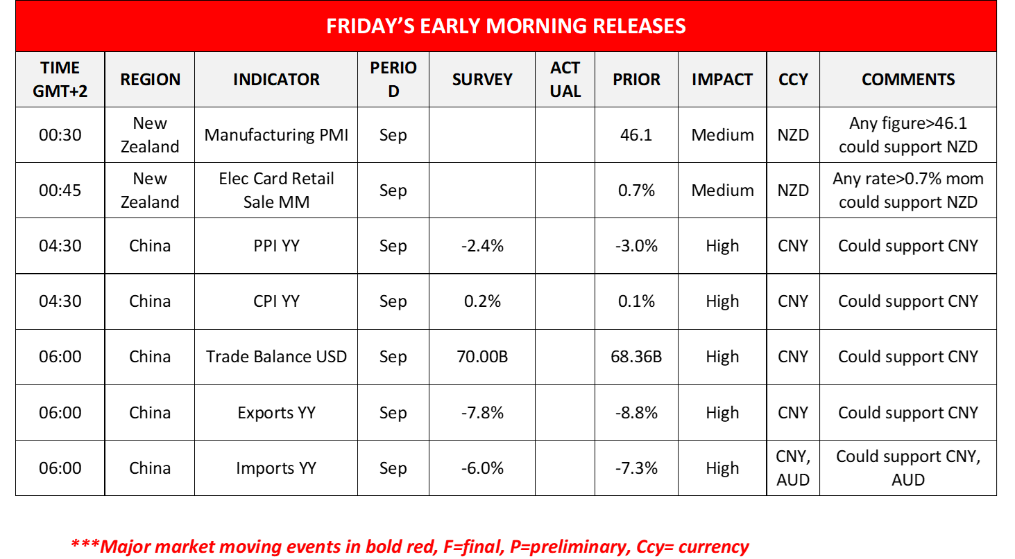 During tomorrow’s Asian session, we highlight the release of China’s trade data for September and should the data imply increased economic activity and a widened surplus we may see CNY getting some support. Aussie traders are expected to turn their attention toward China’s import growth rate and a possible improvement could provide some support for the Aussie as it could imply more exports of Australian raw materials to China. Yet AUD may also be moved by the wider market sentiment as it is considered a riskier asset given its second nature as a commodity currency.
