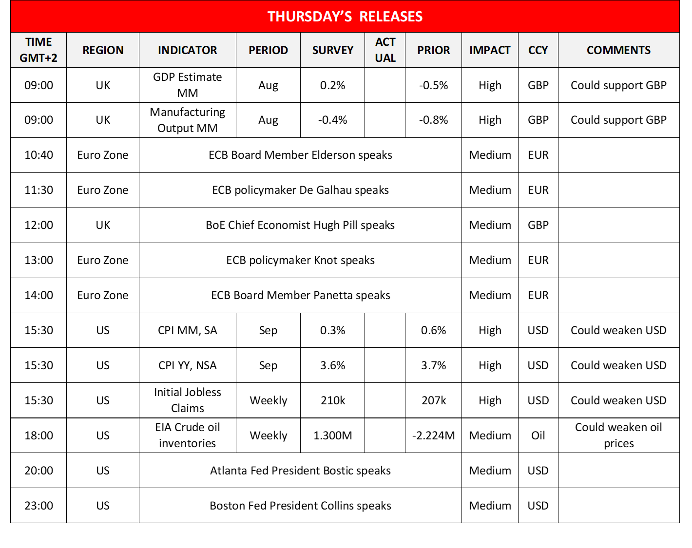 Today we note the release of the US weekly initial jobless claims figure while oil traders may be more interested in the release of the weekly EIA crude oil inventories figure. On the monetary front, we note that ECB Board Member Elderson, ECB policymaker De Galhau, BoE Chief Economist Hugh Pill, ECB policymaker Knot, ECB Board Member Panetta, Atlanta Fed President Bostic, and Boston Fed President Collins are scheduled to speak. During tomorrow’s Asian session, we note the release from New Zealand of September’s manufacturing PMI figure as well as China’s inflation metrics.