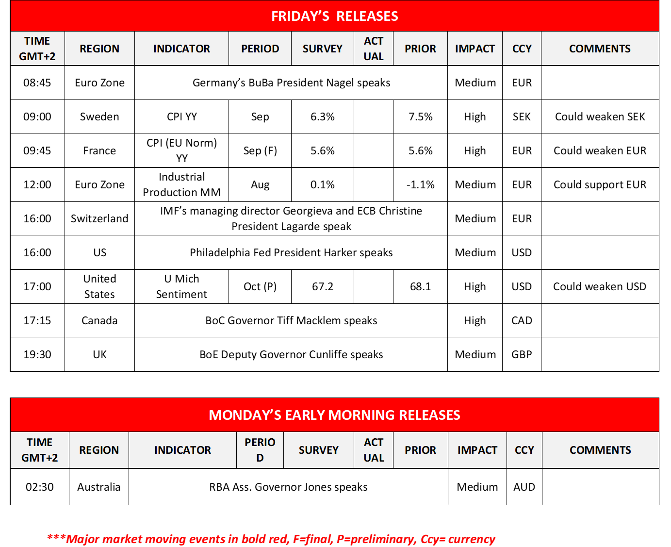Today in the European session, we note the release of Sweden’s CPI rates for September, France’s final HICP rate for the same month and the Eurozone’s industrial output for August. On the monetary front, we note that ECB policymaker Nagel is scheduled to speak in the early stages of the session. In the American session, we note the release of the preliminary US University of Michigan consumer sentiment for October, while we also note the planned speeches of IMF’s managing director Georgieva, ECB President Lagarde, BoC Governor Tiff Macklem and BoE Deputy Governor Cunliffe are scheduled to speak. During Monday’s Asian session, we note that RBA Assistant Governor Jones speaks.