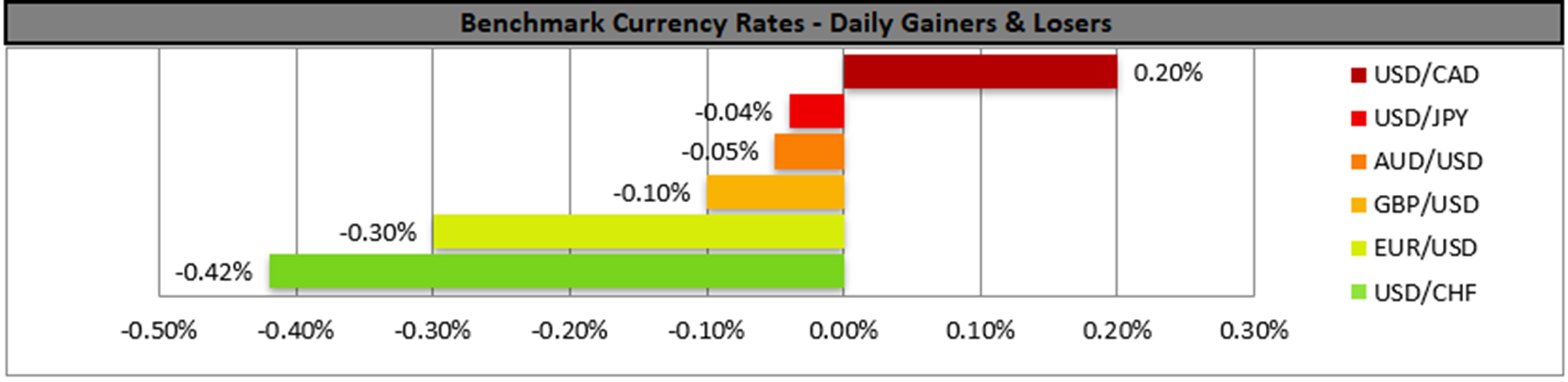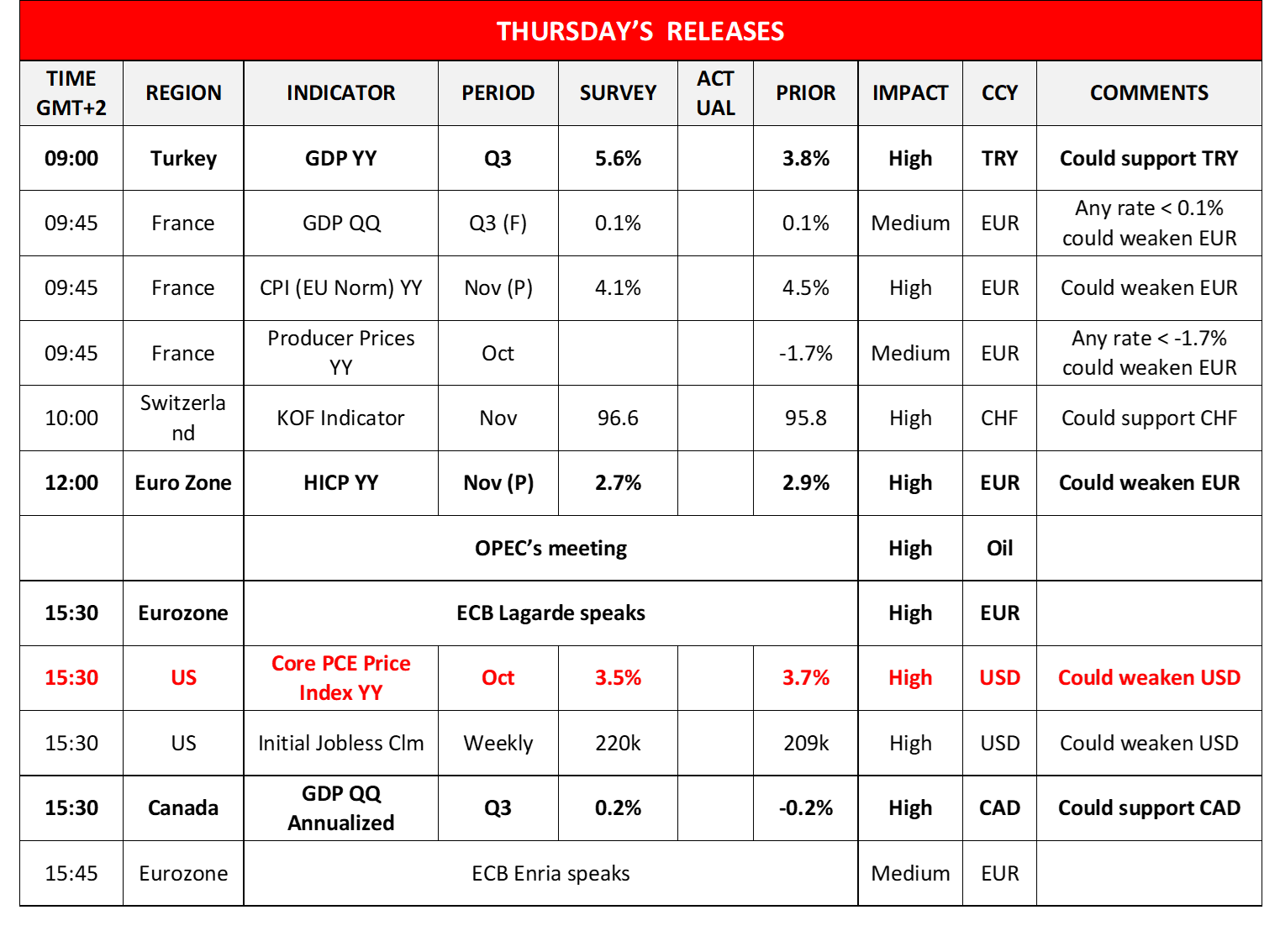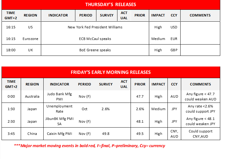 Today in the European session, we get Turkey’s GDP rate for Q3, France’s Final GDP rate for Q3, France’s Preliminary HICP rate for November and their Producer prices figure for October, followed by Switzerland’s KOF indicator figure, Germany’s Unemployment rate and the Eurozone’s Preliminary HICP rate all for the month of November, followed by the Eurozone’s Unemployment rate for October. We tend to expect higher volatility for EUR pairs given the high number of high-impact financial releases stemming from the Eurozone. We single out the inflation measures as well as France’s GDP rate for Q3 as key data to watch out.