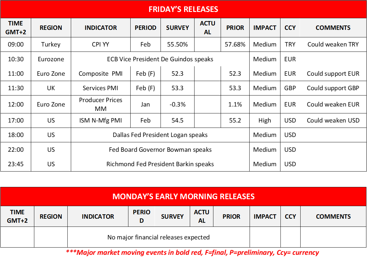 During today’s European session, we note the release of Turkey’s CPI rates for February, Eurozone’s and UK’s final Services and composite PMI figures for the past month and Eurozone’s PPI rates for January, while on the monetary front, ECB’s De Guindos is scheduled to speak. In the American session, we highlight the US ISM non-manufacturing PMI figure for February, and note that Dallas Fed President Logan, Fed Board Governor Bowman and Richmond Fed President Barkin are scheduled to make statements. Also note that an easy-going Monday Asian session is expected as no major financial releases are due out, allowing fundamentals to take over.