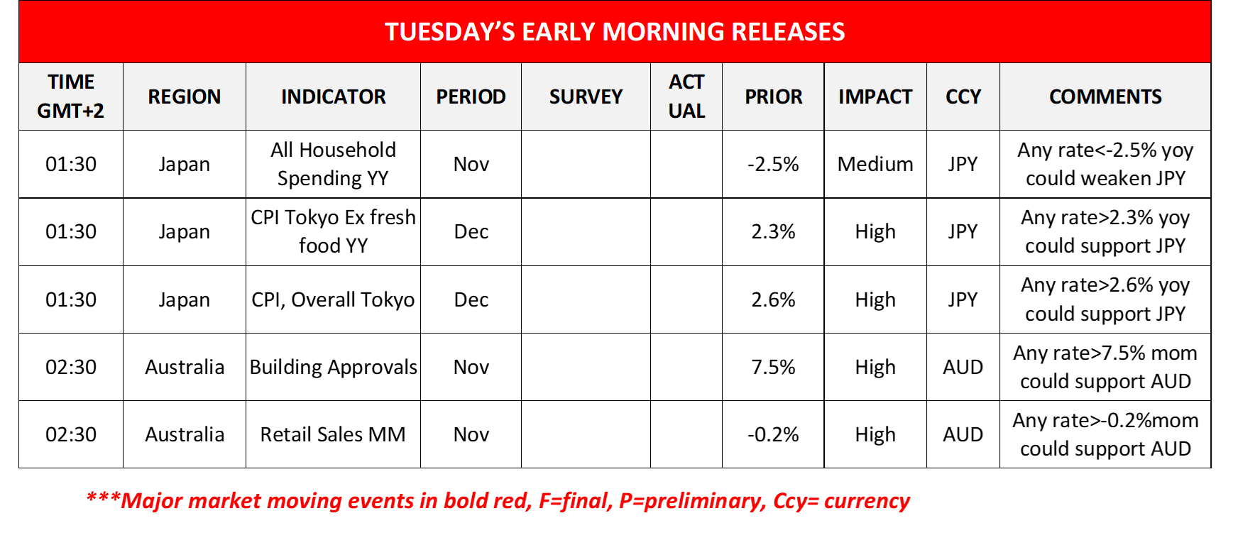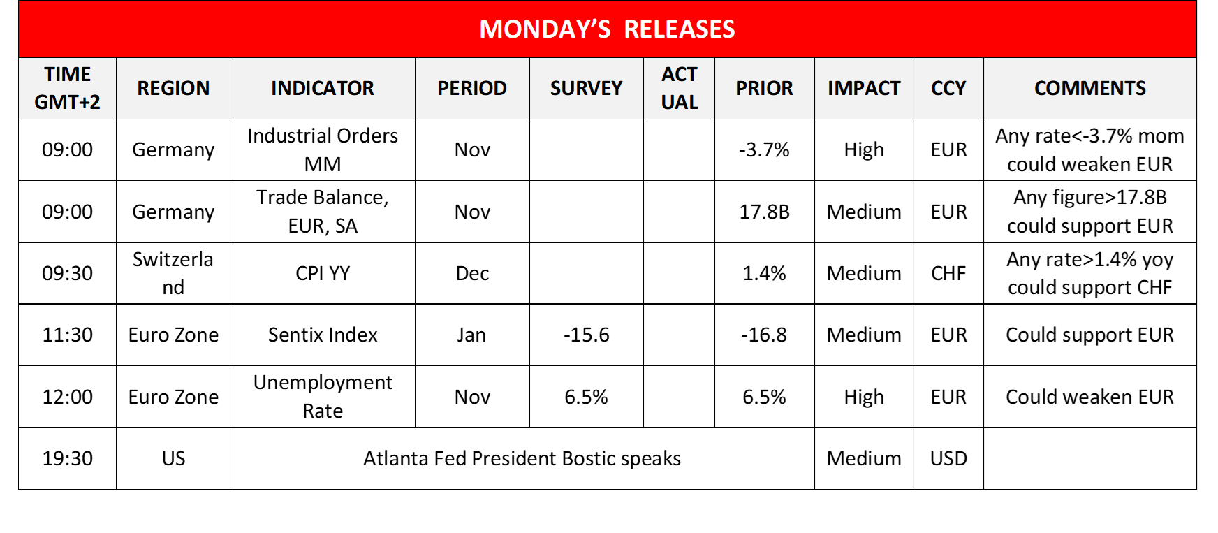 On Tuesday, we note Germany’s industrial production rate both for November and lastly Canada’s Trade balance figure for November. On a quiet Wednesday, we note Australia’s CPI rate for November and Norway’s CPI rate for December. On Thursday, we note Australia’s trade balance figure for November, followed by the Czech Republic’s and the US CPI rates both for the month of December and closing off the day is the US weekly initial jobless claims figure. Finally, on a busy Friday, we note China’s PPI and CPI rates and trade balance figure all for the month of December, followed by the UK’s Preliminary GDP rate, Industrial output rate and Manufacturing output growth rates all for the month of November, France’s Final HICP rates and the US PPI rates both for December.