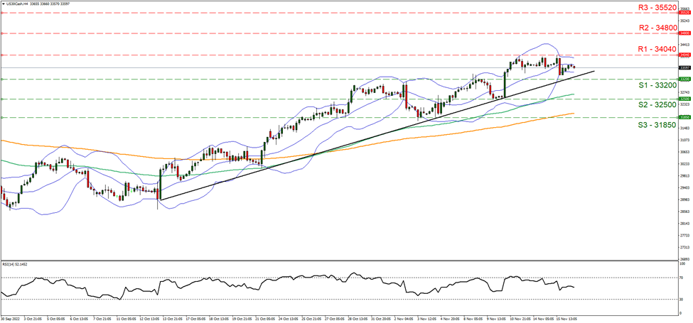 Looking at US30 4-hour chart we observe the upward movement of the index forming higher highs and higher troughs as indicated by the ascending trendline initiated on the 13 of October. We hold a bullish outlook bias for the index given the ascending trendline, but we note the recent stalling of the price action near the 34040 (R1) resistance level. The RSI indicator below our 4 hour chart points to a reading of 54 showcasing slight bullish momentum in favour of the index, however the price action appears to be losing steam. Should the bulls remain in control و positive sentiment reignites, we may see the definitive break above the 34040 (R1) resistance level and head to higher ground towards the 34800 (R2) resistance barrier. Should on the other hand the bears take over, we may see the price action breaking below the ascending trendline, the follow up break of the 33200 (S1) support level and the price action possibly challenging the 32500 (R2) support base.