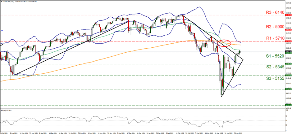 On a technical level, we note the consistency in the rise of the index’s price action since our last report, as S&P 500 broke the 5520 (S1) resistance line, now turned to support. We note that the index’s price action was able to escape the symmetrical triangle being formed by breaking the downward trendline incepted since the 20 of February which tends to highlight the bullish prospective for the index’s price action. Yet despite the bullish signal the RSI indicator tends to note an only marginal rise, remaining just above the reading of 50, implying a relative indecisiveness on behalf of market participants about S&P’s future direction. Should the bulls continue to lead the index’s price action we may see S&P 500 reaching if not breaching the 5710 (R1) resistance level, with the next target for the bulls being possibly at the 5900 (R2) resistance level. A bearish scenario currently seems remote yet is still possible and for its adoption we would require the index’s price action drop, breaking clearly the 5520 (S1) support line and continue to break also the 5345 (S2) support level, while even lower we note the 5155 (S3) support base.