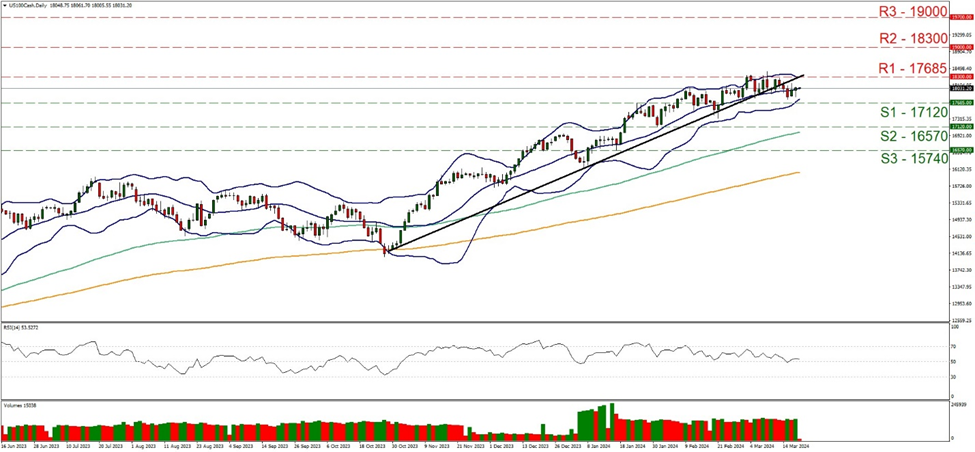 The market’s AI frenzy seems to have been re-energized on Monday after Nvidia organizing its first GTC Conference on Monday. The conference had as a protagonist the company’s next-generation chip, practically showcasing the possibilities the technology promises. According to Financial Times the company’s CEO Jensen Huang stated that Nvidia’s Blackwell graphics processing units would massively increase the computing power driving large language models. The Blackwell GPU has 208bn transistors, compared with 80bn in last year’s H100, in a measure of its increased power. It should be noted that Nvidia’s share price had started to stabilise over the week after a substantial rally since the start of the year. We expect that the event could provide a new push and allow Nvidia to capitalise on the gains. Overall despite the share’s price being at record highs and prone for a possible correction lower, we still have a positive outlook on a fundamental basis.