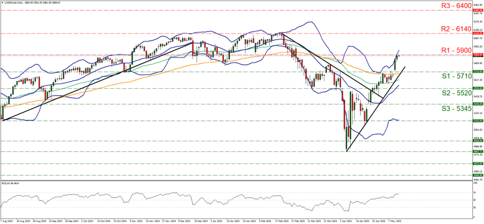 S&P 500 rallied over the past week in a continues upward motion and is currently testing the 5900 (R1) resistance line. We tend to maintain our bullish outlook for the index as long as its price action remains above the upward trendline guiding the index since the 4th of April. The RSI indicator has been nearing the reading of 70, also implying a strong bullish sentiment for the index, yet S&P 500 may be nearing overbought levels, yet for such a comment to come into effect the RSI indicator has to breach above the reading of 70. Should the bulls maintain control over the index aas expected, we may see it breaking the 5900 (R1) resistance line and start aiming for the all time high level marked by the 6140 (R2) resistance barrier. Should the bears find a chance and take over, we may see the index reversing course, initially breaking the prementioned upward trendline in a first signal that the upward motion has been interrupted and continue to break the 5710 (S1) support line with the next possible target for the bears being set at the 5520 (S2) support level.