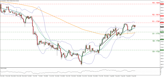 Please note though that fundamentals and the release of the US CPI rates for July could alter gold’s direction either way, depending on the outcome. Should the bulls take over, we may see Gold’s price breaking the 1795 (R1) resistance line that capped its ascent higher on the 4 of August and aim for the 1813 (R2) level that kept the bulls at bay, on the 4 of July. Even higher, we note the 1845 (R3) resistance barrier that has not seen any price action since the 23 of June.