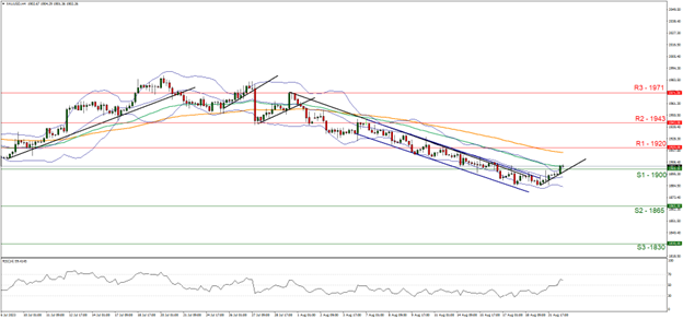 For our bullish outlook to continue, we would like to see a clear break above the 1920 (R1) resistance level, with the next possible target for the bulls being the 1943 (R2) resistance ceiling in addition to continuing to validate our upward-moving trendline formed on the 21 of August. On the other hand, for a bearish outlook, we would like to see a clear break below the 1900 (S1) key psychological support level and a clear break below the 1865 (S2) support level, with the next possible target for the bears being the 1865 (S2) support base.