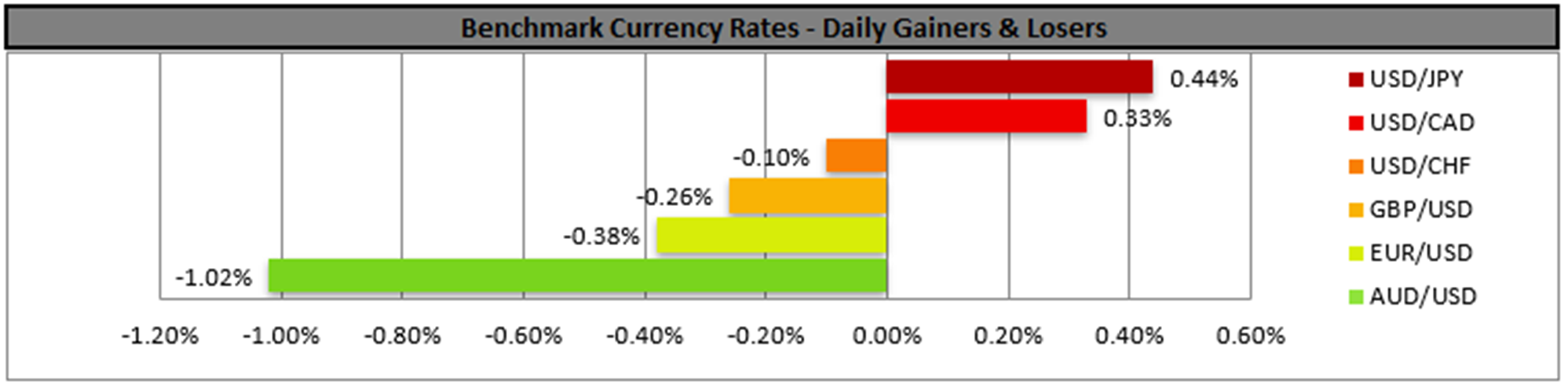 On a technical level yesterday, Cable’s effort to correct higher was thwarted and the pair remained unchanged below the 1.2480 (R1) resistance line. Nevertheless, we tend to maintain our bearish outlook for GBP/USD given that the downward trendline guiding the pair since the 8 of March, remains intact and that the RSI indicator remains near the reading of 30, implying a strong bearish sentiment in the market for the pair. Should the bears maintain control over the pair, we may see it breaking the 1.2375 (S1) support line and aiming for the 1.2205 (S2) support level. Yet the price action has broken below the lower Bollinger band, which may slow down the bears. Should the bulls find a chance and take over, we expect GBP/USD to reverse direction, break the 1.2480 (R1) resistance line and continue to break the prementioned downward trendline, in a first signal that the downward motion has been interrupted. Should the downward trendline be broken, we set the next possible target for the bulls the 1.2600 (R2) resistance level.