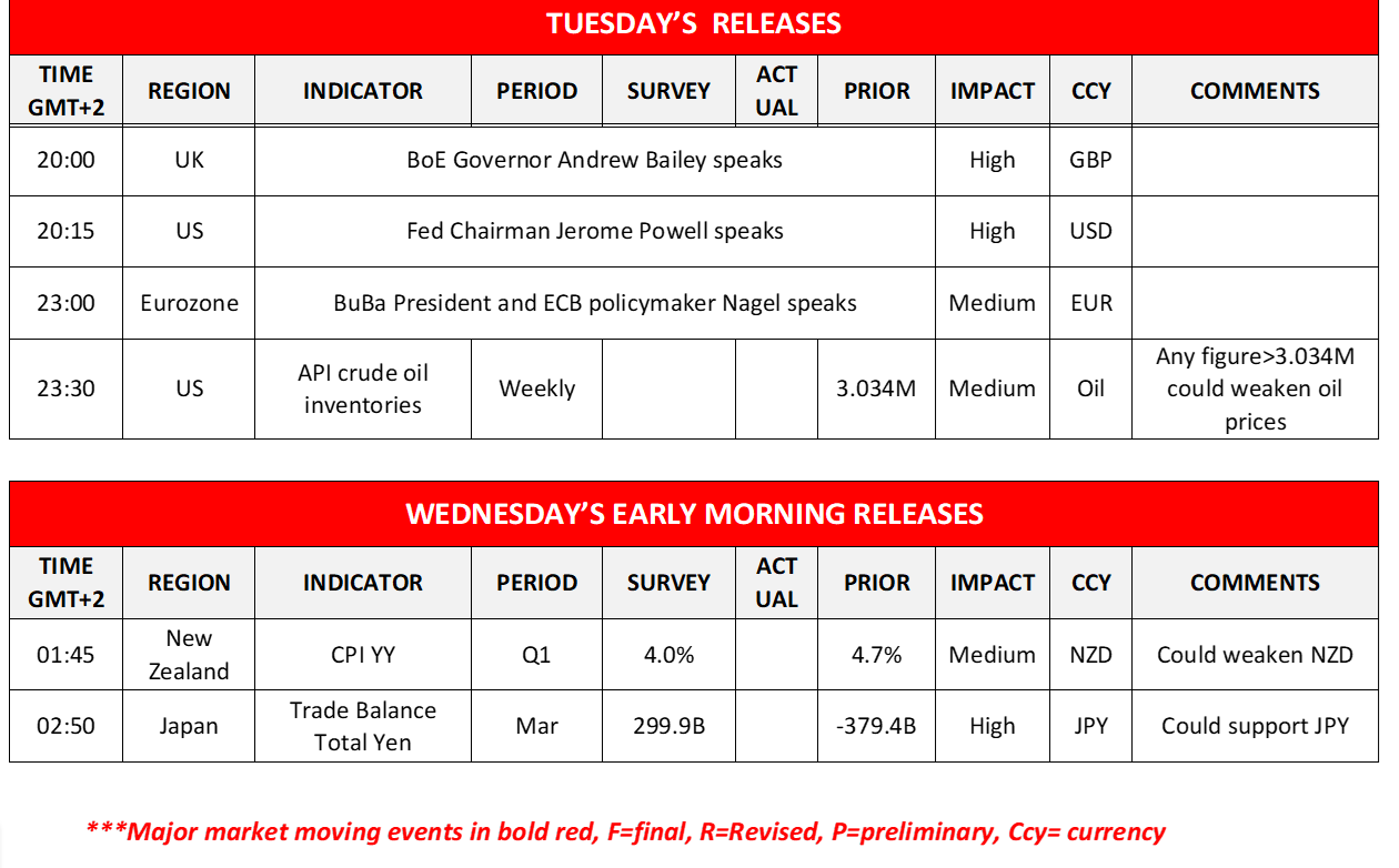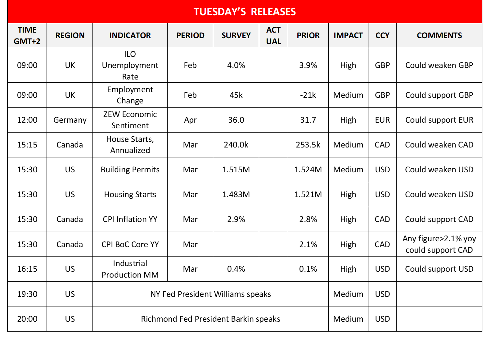 In today’s European session Germany’s ZEW indicators for April. In the American session, we get Canada’s and the US Housing data and we highlight the release of Canada’s CPI rates, the US industrial output all being for March while later on oil traders may be more interested in the release of the API weekly crude oil inventories figure. On the monetary front, we note that NY Fed President Williams, Richmond Fed President Barkin, BoE Governor Andrew Bailey, Fed Chairman Jerome Powell and BuBa President and ECB policymaker Nagel are scheduled to make statements. During tomorrow’s Asian session, we get New Zealand’s CPI rates for Q1 and Japan’s trade data for March.