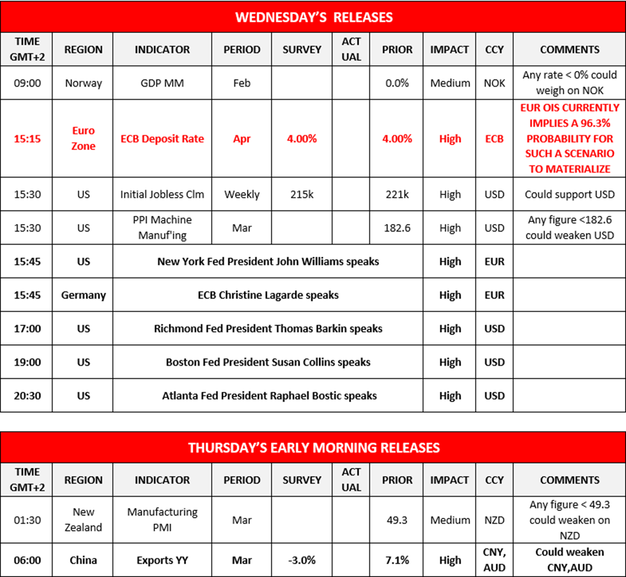 Today, during the European session, we begin with Norway’s GDP rate for February. In the American session, we note the US weekly initial jobless claims figure and the US PPI Machine Manufacturing figure for March. In tomorrow’s Asian session we note New Zealand’s Manufacturing PPI figure for March, China’s trade data for March and Japan’s revised industrial output rate for February. On the monetary front, we highlight the ECB’s interest rate decision, followed by the speeches by New York Fed President Williams, ECB President Lagarde, Richmond Fed President Barkin, Boston Fed President Collins and Atlanta Fed President Bostic.