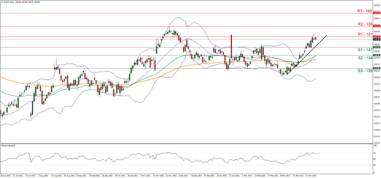 Looking at #WMT Daily chart we observe investors having reacted favourably to last week’s employee reduction announcement, in addition to the closing of four Chicago stores. We hold a bullish outlook bias for Walmart, given the formation of an upwards trendline since the 15th of March. Supporting our case is the RSI indicator below our daily chart which currently stands at 70, indicating a strong bullish sentiment surrounding the retail behemoth. Furthermore, the RSI indicator staying at 70 may signal that the bulls are eager and are actively trying to push prices higher ground. Should the bulls extend their reign, we may see the break above the 151 (R1) resistance level and the move towards the 155 (R2) resistance barrier. For a bearish outlook we would like to see a clear break below the 147 (S1) support level with the next possible target for the bears being the 144 (S2) support base.