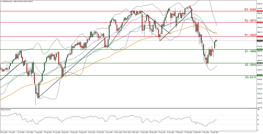 The S&P500 appears to be moving in sideways fashion after clearing our resistance now turned to support at the 5685 (S1) level. We would opt for a sideways bias for the index and supporting our case is the RSI indicator below our chart which currently registers a figure near 50, implying a neutral market sentiment. Yet we must note that the Bollinger bands still remain extremely wide, implying high market volatility and when looking at the RSI indicator’s ascent from the 30 to 50 figure currently, it could also imply that the bulls may be taking the reins. Nonetheless, for our sideways bias to be maintained we would require the index’s price to remain confined between the 5685 (S1) support level and the 5820 (R1) resistance line. On the flip side for a bullish outlook we would require a clear break above the 5820 (R1) resistance line with the next possible target for the bulls being the 5970 (R2) resistance level. Lastly, for a bearish outlook we would require a clear break below our 5685 (S1) support level with the next possible target for the bears being the 5540 (S2) support line.